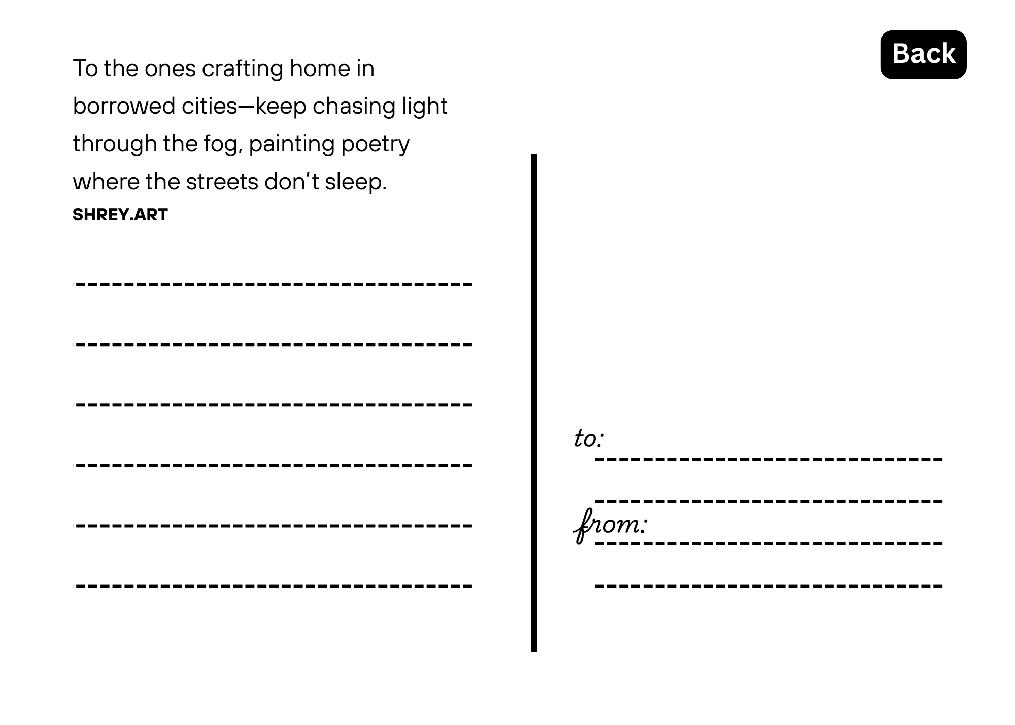 Bring home a piece of San Francisco with these 5×7 matte-finish postcards featuring original paintings by Shrey Purohit. Perfect for framing, gifting, or sending to someone special. Choose from three designs that capture the city’s light and atmosphere: